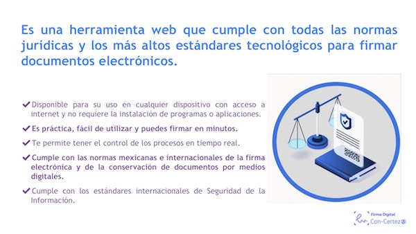 Firma Digital Con-Certez@ es una herramienta web de firma digital que cumple al 100% con el marco normativo mexicano referente a la firma electrónica y a la conservación de documentos electrónicos, de tal forma que obtendrás documentos con la misma certeza legal que aquéllos que son firmados físicamente en papel.